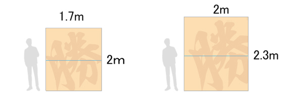 図中、人のシルエット身長は170cm、旗の横線(青い線)は布の縫いつなぎの部分になります。以下のサイズは旗本体の製作料金となります。もちろん下のサイズ以外でも製作可能です。ご予算と合わせてご検討ください。(印刷代・布代・袋ぬい・突き出し防止布加工を含む。下部ハトメ加工は+¥880)