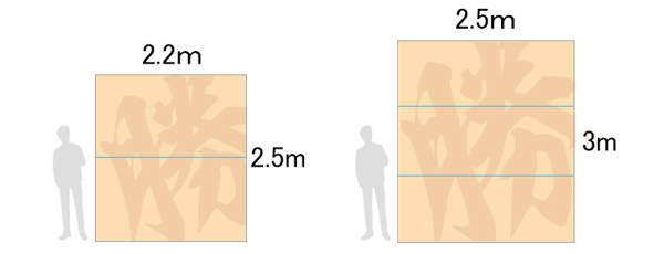 図中、人のシルエット身長は170cm、旗の横線(青い線)は布の縫いつなぎの部分になります。以下のサイズは旗本体の製作料金となります。もちろん下のサイズ以外でも製作可能です。ご予算と合わせてご検討ください。(印刷代・布代・袋ぬい・突き出し防止布加工を含む。下部ハトメ加工は+¥880)