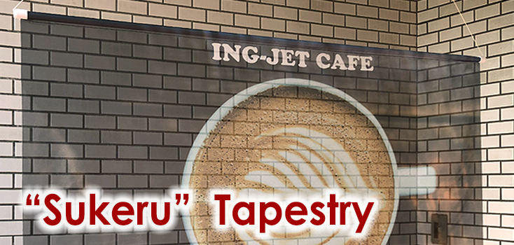 通常の布を使った「タペストリー」とは異なる、「透けるタペストリー」の製作サービスです。印刷用にご用意している布は、「ボイル」という布です。このボイルを使用してタペストリーを製作して欲しい、というお問い合わせが増えてきた為に、「透けるタペストリー」サービスを開始いたしました。